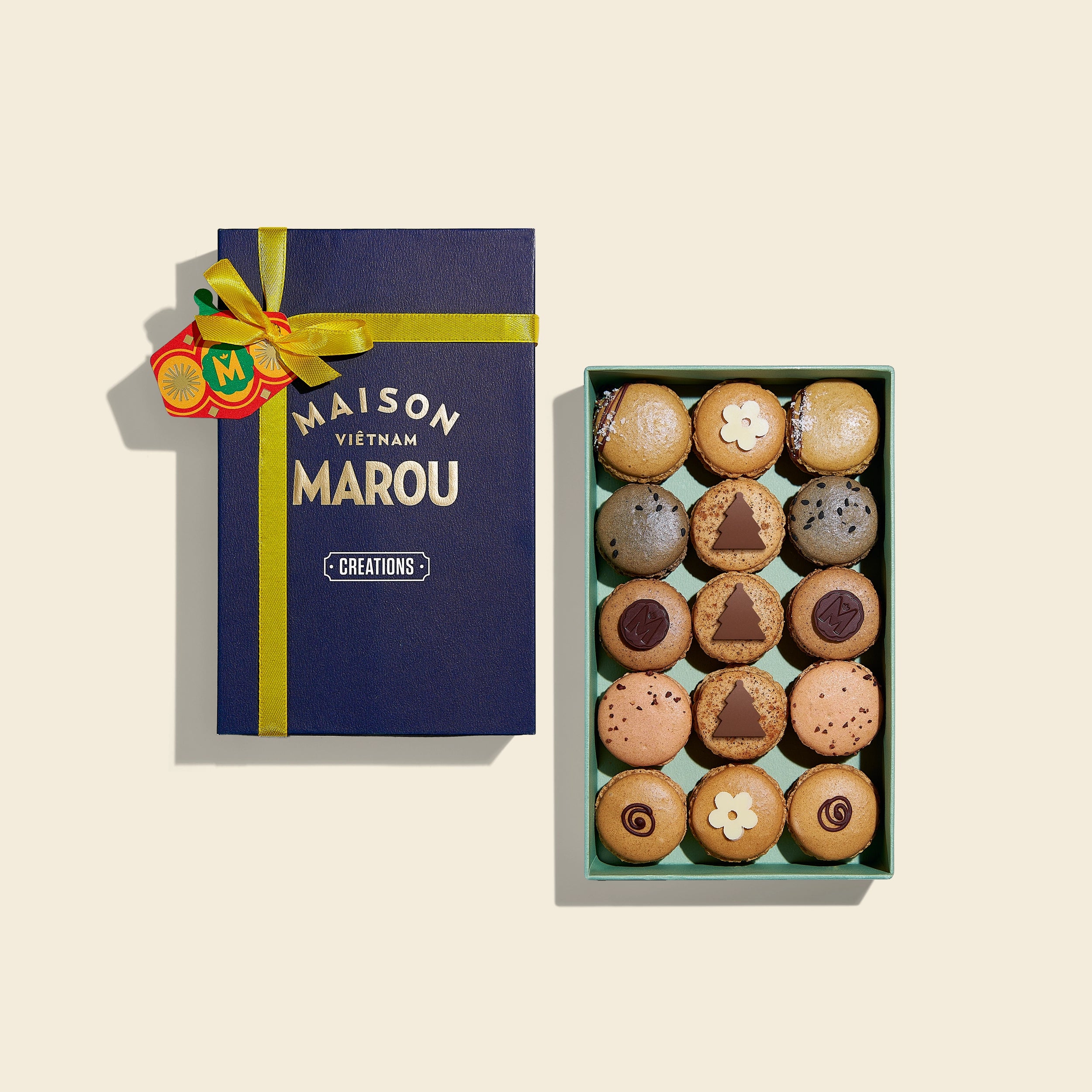 Vỏ hạt điều mềm mịn ôm trọn nhân ganache sô cô la Marou, hòa cùng cam, hoa hồi và mật ong Mekong. Dịu dàng, thơm ngát và ấm áp hương lễ hội, như một miếng nhỏ của niềm vui Giáng Sinh.